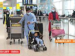 A passenger arriving from ‘red list’ India (left) and another arriving from New York in ‘amber list’ US (right) arrive at the same time at London Heathrow Airport’s Terminal 2 yesterday