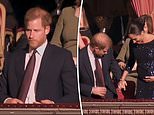Meghan Markle put on a brave face to mask her pain while Prince Harry gave away tell-tale signs of anxiety by ‘sucking his lips’ (pictured) during their appearance at the Royal Albert Hall, body language expert Judi James observed