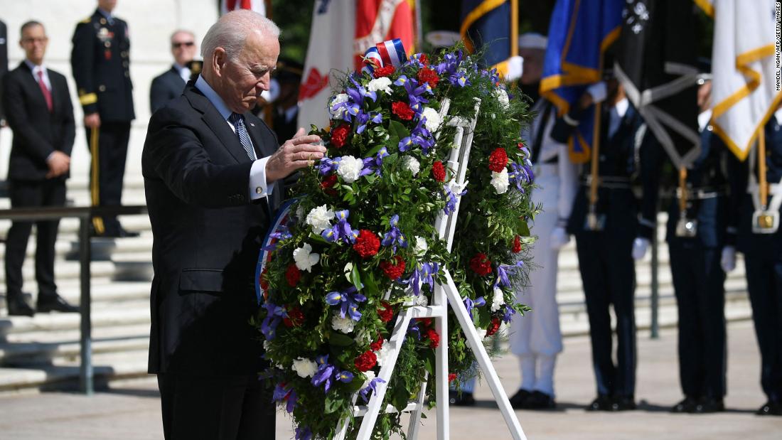 Earlier on Monday, Biden, first lady Jill Biden, Vice President Kamala Harris, second gentleman Doug Emhoff, Defense Secretary Lloyd Austin and Chairman of the Joint Chiefs of Staff Gen. Mark Milley participated in a wreath-laying ceremony at the Tomb of the Unknown Soldier at Arlington National Cemetery.