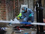 After the crime scene was set up, officers were pictured combing through discarded items on the street – including a black shoe, clothes and a bright green bag.