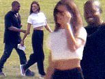 Casual couple: Irina looked stunning a white crop top while Kanye went low-key in a black T-shirt as the pair looked every inch of the happy new couple