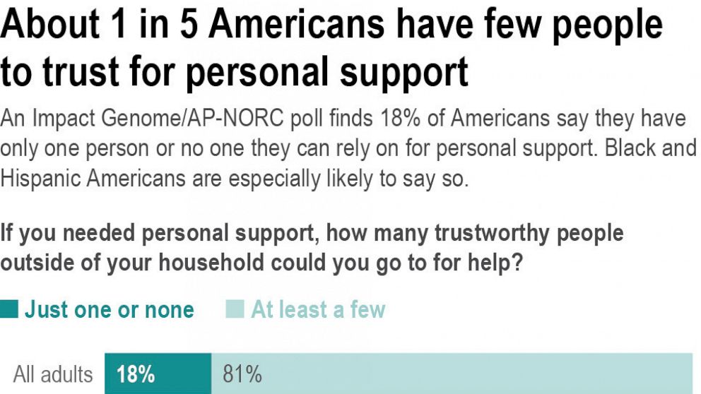 The poll finds 18% of U.S. adults, or about 46 million people, say they have just one person or nobody they can trust for help in their personal lives, such as emergency child care needs, a ride to the airport or support when they fall sick. And 28% say they have just one person or nobody they can trust to help draft a resume, connect to an employer or navigate workplace challenges.
