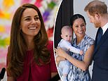 Kate Middleton spoke while in Hayle, Cornwall, today (left) – one week after Prince Harry and his wife Meghan Markle welcomed their second child who is a younger sister to Archie (right, pictured together in South Africa in September 2019)