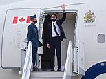 Canada‘s Prime Minister Justin Trudeau arrived at Cornwall Airport in Newquay wearing a face mask yesterday and waved from the exit of his jet beside his country’s coat of arms and maple leaf flag.