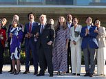 Meanwhile French First Lady Mrs Macron, who often opts for classic, neutral tones, opted for a smart beige two-piece with a white organza lace top and chic pearl wedges.