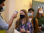 A health worker takes the temperature of a student in a queue to receive a dose of the Pfizer/BioNTech Covid-19 vaccine at a vaccination centre in London on June 5
