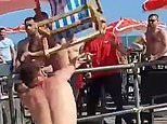 Shocking footage has captured the moment bloodied brawling men were seen hurling deckchairs and glass bottles at each other during a fight that erupted on the beach yesterday.