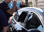 Video shows one officer using his baton to smash the back window of the black vehicle as the owners rushed back to the scene in horror.
