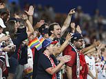 Because while the UK faces another four weeks of restrictions, everything is going on in the U.S. People are going to cinemas, nightclubs, bars, churches and baseball games ¿ all filled to capacity, and mingling at close quarters with strangers. Pictured: Fans cheer as the US play against Jamaica in a soccer match in Houston, Texas on June 13