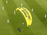 The activist, who had ‘Kick Out Oil’ emblazoned on his yellow parachute, glided into the stadium before losing control