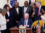 ‘I’m especially pleased that we showed that nation that we can come together as Democrats and Republicans to commemorate this day with the overwhelming bipartisan support in Congress,’ Biden said.