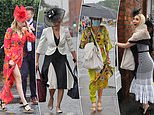 Brushing off the bad weather! Women put on showstopping displays in colourful outfits as they arrived for Ladies Day
