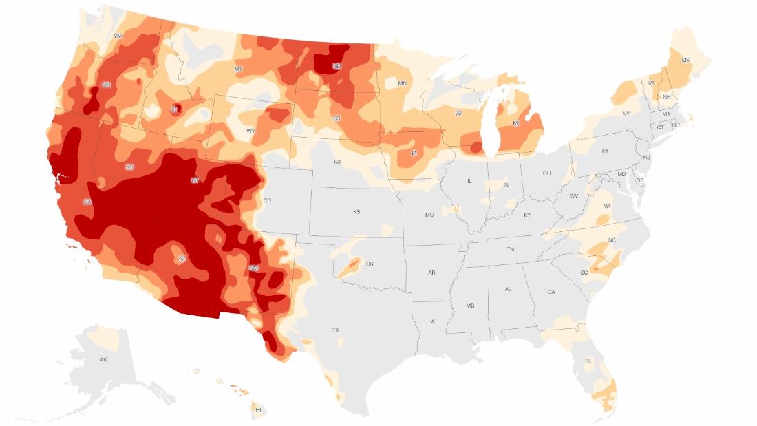 The West experienced extremely low rain and snowfall over the past year, compounded by drastically high temperatures. Less rain and increasing heat waves have led directly to drought conditions and water shortages.