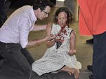 • DailyMail.com photos show the woman sat on the ground with blood pouring from her face; a man was seen handcuffed and being led away by police