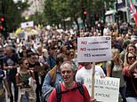 Tens of thousands of protesters had earlier marched through Oxford Street, Regent Street, Hyde Park and Northumberland Avenue as they held placards reading ‘the Boris variant’, ‘no to Covid vaccine’ and ‘no to Covid passport’.