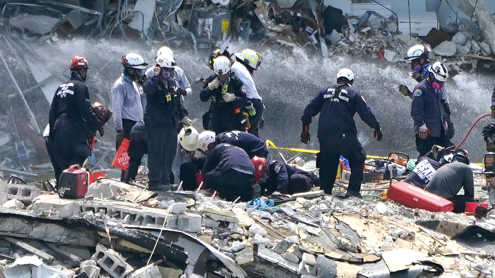Rescue workers search the rubble of the Champlain Towers South condominium, Saturday, June 26, in the Surfside area of Miami. Lynne Sladky/AP