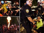At least three people have been arrested in Washington Square Park during Pride celebrations on Sunday afternoon. Police were pictured dressed in riot gear together with helmets, shields and batons drawn