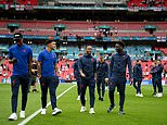 England forwards Raheem Sterling and Bukayo Saka inspect the Wembley pitch as the clock ticks down kick-off