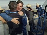Oliver Daemen, 18, fell into his father’s arms after safely emerging from Jeff Bezos’ New Shepard rocket which shot into space for a trip lasting just over 10 minutes.