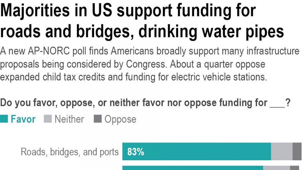 WASHINGTON — The overwhelming majority of Americans — about 8 in 10 — favor plans to increase funding for roads, bridges and ports and for pipes that supply drinking water. But that’s about as far as Democrats and Republicans intersect on infrastructure, according to a new poll from The Associated Press-NORC Center for Public Affairs Research.