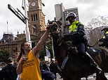 A long-haired protester – wearing a T-shirt bearing the message ‘free speech – more important than your feelings’ – was seen throwing his left fist at the horse’s face during chaotic scenes outside Sydney’s Town Hall station.