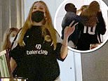 The star also wore a black face mask, while her caramel tresses were worn loose with a centre-parting.