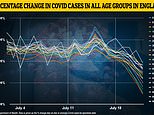 This graph shows the daily percentage change in the seven-day Covid infection rate per 100,000 people split by age group. It reveals infections are falling fastest among young adults in their 20s (orange) by 15 per cent. Cases among 20 to 24 year olds fell from 1,091 per 100,000 on average on July 21, to 922.7 per 100,000 on July 22. But infections are dropping in all age groups. Among those in their early 80s (pale orange) they fell by 3.2 per cent from 74.9 per 100,000 on July 21 to 72.5 per 100,000 on July 22