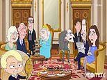 The Prince, created by Family Guy producer Gary Janetti, centres around a fictional version of Prince George as a child tyrant with expensive taste, a withering sense of humour and a dim view of his family – particularly his thuggish brother Louis. It premieres in the US today. Pictured l-r: Camilla, Prince Charles, the Queen, Prince Philip, Prince William and Kate