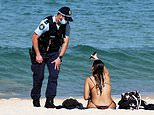 Pictured: A woman on Sydney’s iconic Bondai Beach shows her ID to a police officer. Police check IDs to ensure visitors to the beach meet the exercise radius stipulated in lockdown directives