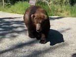 The video, which was shot by Cara Siciliano in Alaska’s Katmai National Park, shows how she was walking down the path with her friends when the bear suddenly appeared from behind them.