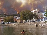 GREECE: People swim in the sea off the island of Evia, north of Athens, on Tuesday as a fire rages in the hills above their coastal villas. The Greek coast guard rallied an flotilla of patrol boats and private vessels to evacuate hundreds of residents and vacationers by sea after several fires combined to block land routes off the island.