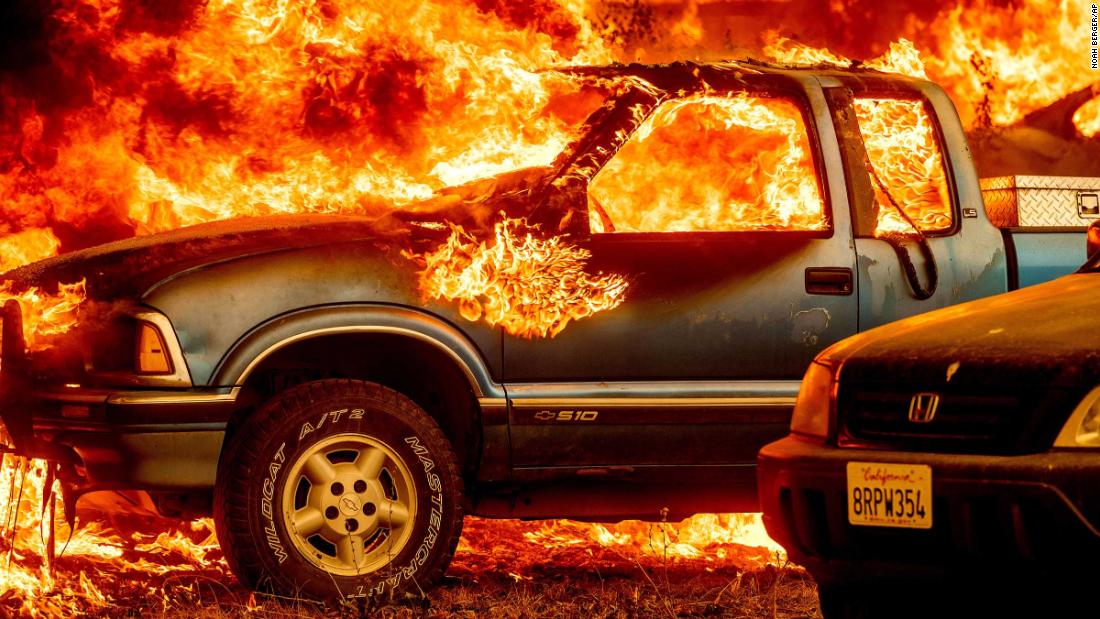 Flames from the Dixie Fire consume a pickup truck on Highway 89, south of Greenville, California, on Thursday, August 5.