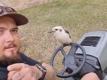 Adorable moment a VERY tame kookaburra perches on a man’s lawn mower as he drives it around a backyard