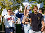 A-level grades could be scrapped in a massive overhaul of the education system to tackle soaring grade inflation that led to a record day of top marks in student results. Pictured: Happy students wave their A-Level results after collecting them at Taunton School in Somerset