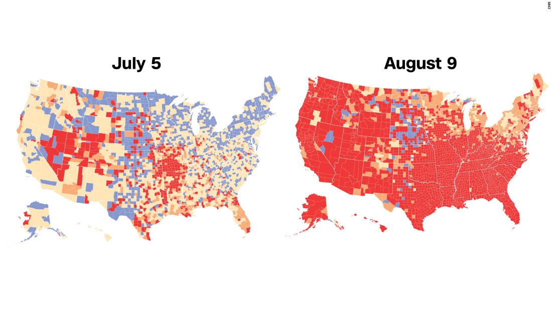 The latest figures from the CDC show an alarming rise in the number of counties that are considered at high risk of community transmission. On Monday, 2,361 counties in the United States were listed in the “high” tier, a stark increase from 457 counties in the same tier at the beginning of July. A look at the past five weeks shows just how rapidly community transmission has increased across the country.