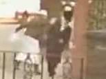 The unidentified attacker appears to be dressed in white, wearing a headdress and a greenish brown coat in both clips, which are being investigated by police.