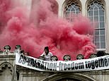London’s police warned the protests will distract officers from dealing with crime while they focus on minimising disruption. Pictured: Smoke bombs are let off at protests today at the entrance to Guildhall