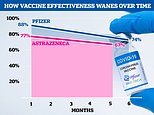 For Pfizer, protection against infection dropped from 88 to 74 per cent six months after the second doseAnd for AstraZeneca, protection dipped from 77 to 67 per cent five months after the second jabProfessor Tim Spector warned effectiveness against infection could dip below 50 per cent by the winter