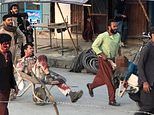The large explosion at Kabul explosion filled the air with smoke (left), while those injured in the suicide bomb attack were carried away from the scene