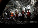 Members of the British armed forces disembark a C-17 aircraft after landing at Brize Norton