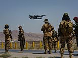 The Taliban must be trembling in their trainers. With the troops out, the West no longer has any leverage. Pictured: Taliban fighters securing the airport perimeter in Kabul as evacuation flights depart overhead