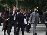 They hugged, smile and laughed before Harry and Meghan walked down towards the 9/11 memorial alone. A fan shouted ‘Beautiful Meghan, I love you!’ prompting the Duchess to smile and say ‘Thank you.’