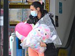 A man struggles to carry all of the toys he has bought at Smyths Toy Superstore in St Albans, Herts