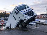 Photos of the large HGV show the front still on the raised walkway, while the bottom half is submerged in the water.