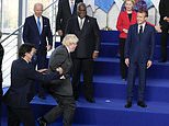 One hilarious image seemed to capture the moment Mr Trudeau held onto Mr Johnson’s arm as they made their way onto the platform.