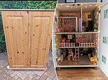 Wanting to avoid something so expensive and made of plastic, Faith bought a second hand pine cabinet and then transformed it using everything from lollipop sticks to washing up sponges and nail varnish. Pictured, the finished doll’s house