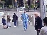 Disgraceful moment anti-vaxxer parades through the streets dressed as a Nazi death camp inmate holding a sign comparing Covid vaccine mandates to the Holocaust – until he is bashed by an outraged woman
