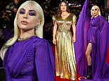 Lady Gaga makes show-stopping entrance to House Of Gucci premiere in London wearing sweeping purple gown and fishnet stockings while co-star Salma Hayek dazzles in gold