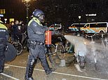 In the clip, dozens of protestors can be seen sitting on the ground where they brace for impact as police turned the water cannons on them. As they turn their backs and shield one another from the barrage, officers spray them again.