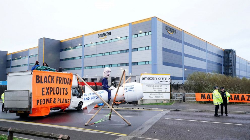 Climate activists are blockading Amazon warehouses across the U.K. on Friday in an attempt to pressure the ecommerce giant on one of its busiest days of the year to improve working conditions and end business practices that hurt the environment.